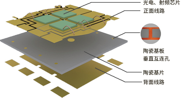 薄膜電路陶瓷封裝基板是一種通過磁控濺射薄膜金屬化與電鍍制程的技術:即根據應用需要,在高導熱的陶瓷基體上,采用薄膜金屬化及影像轉移方式制作2D金屬線路,然后采用TCV(Through Ceramic Via) 技術形成雙面布線間的垂直互連,最后采用堆疊技術獲得與陶瓷基體結合緊密的一體式3D金屬框架。基于薄膜電路工藝,通過磁控濺射實現陶瓷表面金屬化,通過電鍍實現銅層和金成的厚度大于10微米以上即DPC(DirectPlateCopper-直接鍍銅基板)。